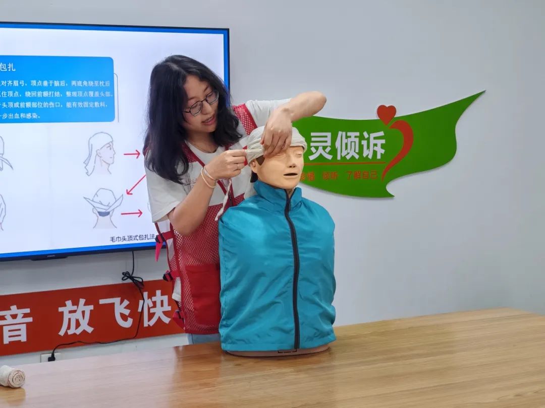 第二部分,红十字会成员向同学们讲解了创伤救护的相关知识,向大家演示了回返式包扎方法,同学们都认真学习,并积极上手实操。