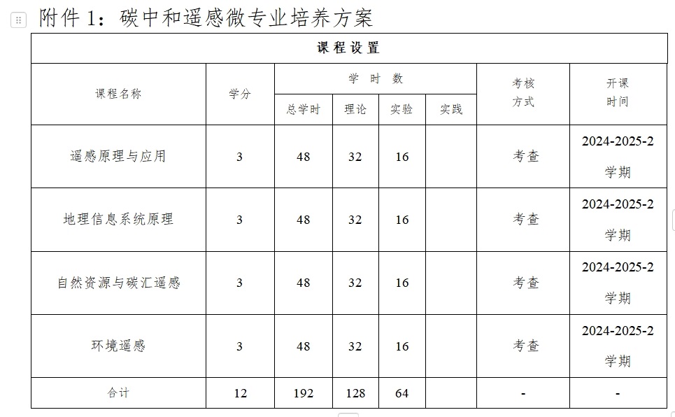 结合碳中和遥感微专业员工培养总体思路,整合专业教学资源,分析相关课程对培养工程能力、工程师素养的基础上,构建了碳中和遥感微专业课程体系,总学分为12学分,详见微专业培养方案(附件1)。