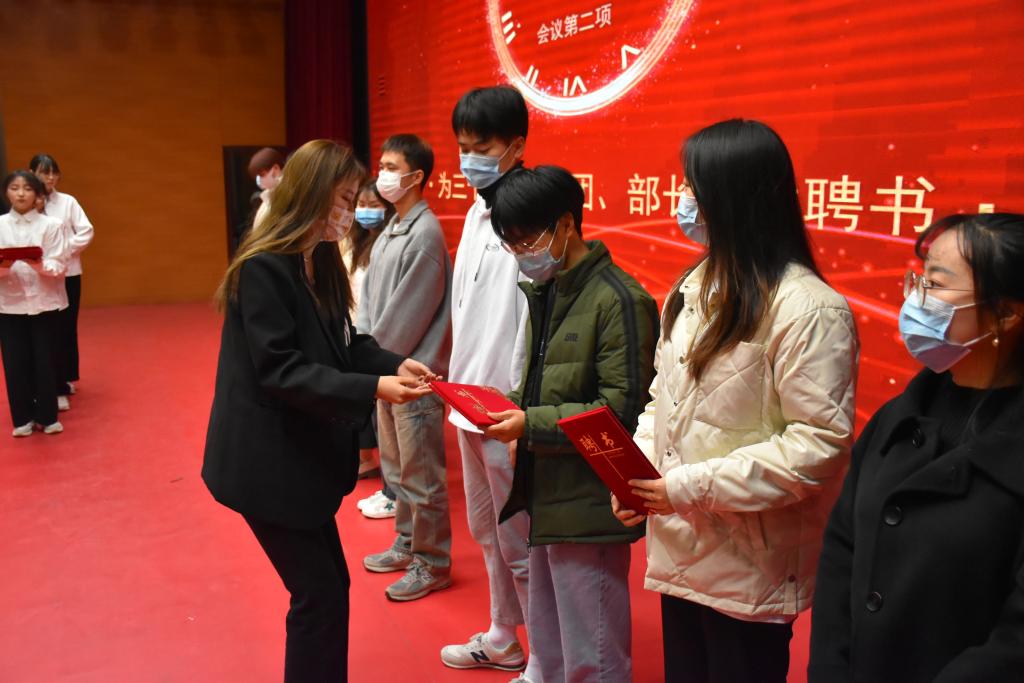 会议伊始,由团委书记张雷、团委副书记全佳豪、员工会主席王艺臻为第三十三届主席团及部长颁发聘书。在此之后由第三十三届团委副书记陈艳丽、现任团委副书记全佳豪、员工会主席王及部长、干事代表分别做了发言,他们均表示要本着“为同学服务”的宗旨,严于律己、以身作则,把公司所急、同学所需、团委员工会所能作为工作出发点、落脚点,从而共同开创团委员工会的新局面。
