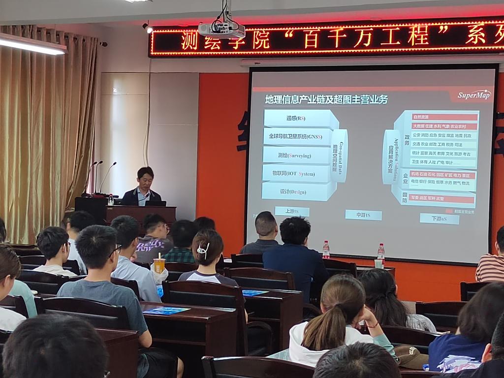 在讲座中,陈经理基于丰富的GIS产品研发和应用经验,首先从GIS基础软件的发展过程、GIS产业发展前景、地理信息产业链及超图的主营业务等几个方面为师生们进行详细介绍。随后,他以典型案例分享了超图软件以地理智慧赋能产业数字化的主要方式,在与云计算、大数据、人工智能等技术相结合后,GIS基础软件围绕地理可视化、地理决策、地理设计和地理控制等方面在不同行业领域进行技术创新与应用的相关情况。