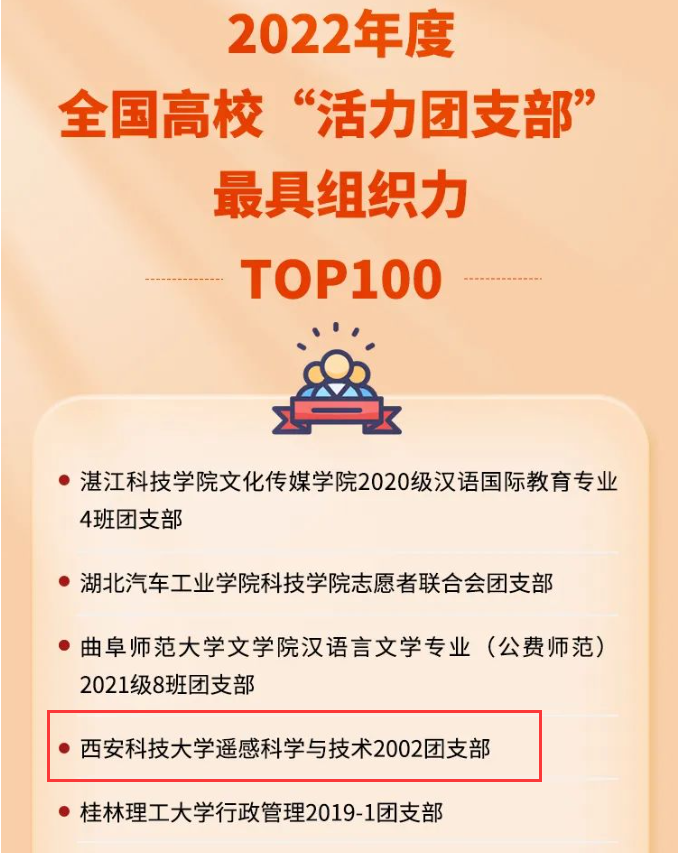 近日,由团中央基层建设部指导、中国青年报社主办开展的“活力团支部”《2022年度高校活力团支部最具组织力TOP100榜》已揭晓。经基层申报、公司推荐、省级初评、网络展示、全国终审等环节,院遥感科学与技术2002团支部的“活力值”排名全国第四,成功入选,并在《中国青年报》上展示支部活力风采、改革建设成果和典型经验。