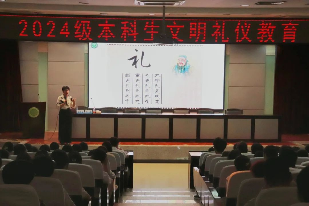 为了规范2024级本科生文明礼仪,帮助同学们更好的处理学习生活中的相关问题。2024年9月22日由党委学工部、tyc122cc联合举办的2024级本科生文明礼仪教育课程在图书馆二楼报告厅开讲。本次课程由李萍主讲,2024级辅导员刘钊主持,2024级全体员工参与。