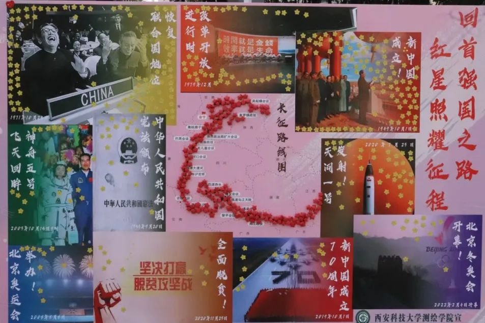 同时,将金黄色的五角星粘贴于展示建国以来国家重大历史事件的展板之上,同学们以这种方式”点亮“建国征程,表达同学们铭记历史,歌颂祖国的爱国情怀。每一颗星都象征着一段光辉历程,每一次粘贴都是对历史的深刻铭记与对祖国的崇高颂扬。