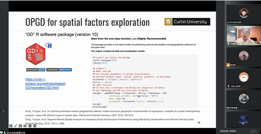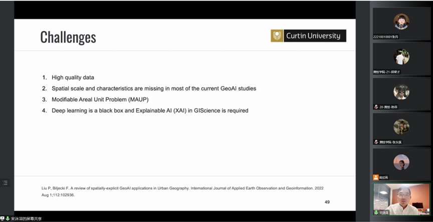 报告中,宋泳泽博士主要介绍了地理空间数据分析和地理空间人工智能的概念、发展历程、现存问题及相关应用等,详细讲解了其在空间因素分析和空间预测方面的典型应用,并分析了该领域未来研究趋势及可能面临的挑战。最后,宋泳泽博士同与会师生就相关问题进行了交流和讨论。