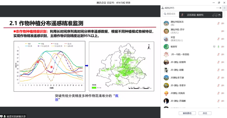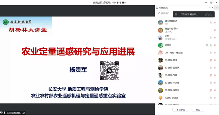 11月9日下午,tyc122cc举办“胡杨林大讲堂”。长安大学地质工程与tyc122cc杨贵军教授应邀做客公司“胡杨林大讲堂”,作了题为《农业定量遥感研究进展及应用》的学术报告。本次胡杨林大讲堂以线上腾讯会议形式举行,报告由副经理史晓亮主持。
