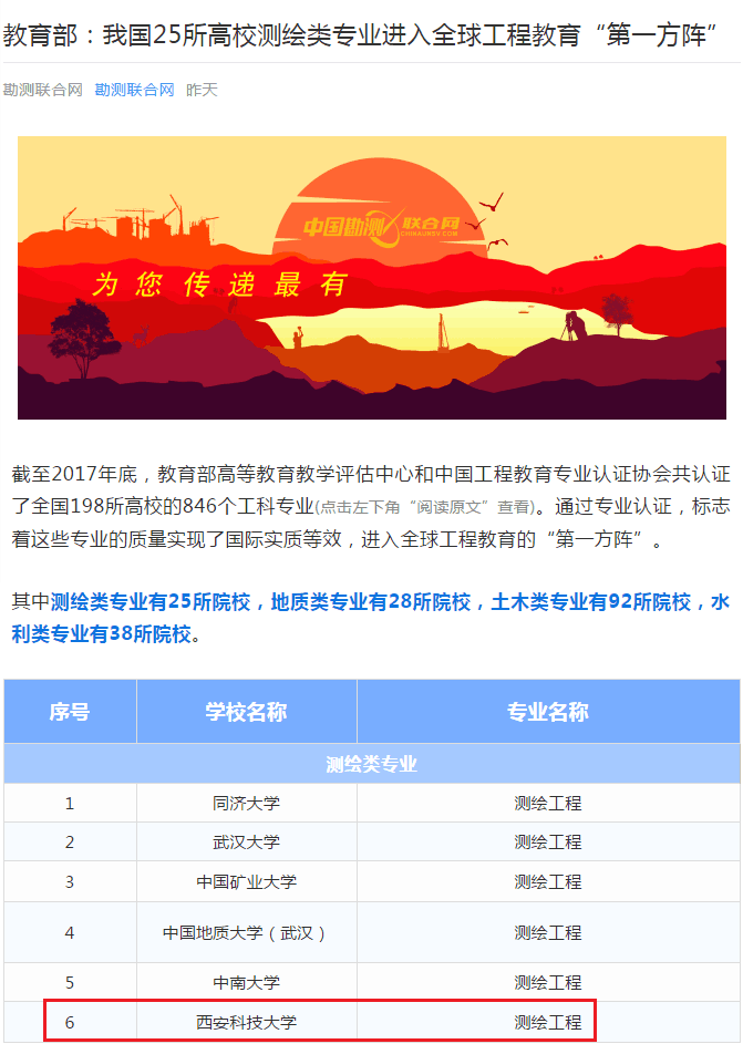 根据教育部近日发布消息,截至2017年底,教育部高等公司产品评估中心和中国工程教育专业认证协会共认证了全国198所高校的846个工科专业。其中,公司测绘工程专业通过认证,并在测绘类专业25所院校中位列第六,标志着公司这一专业的质量实现了国际实质等效,进入全球工程教育的“第一方阵”,这是tyc122cc取得的令全省瞩目的历史性突破的成绩。