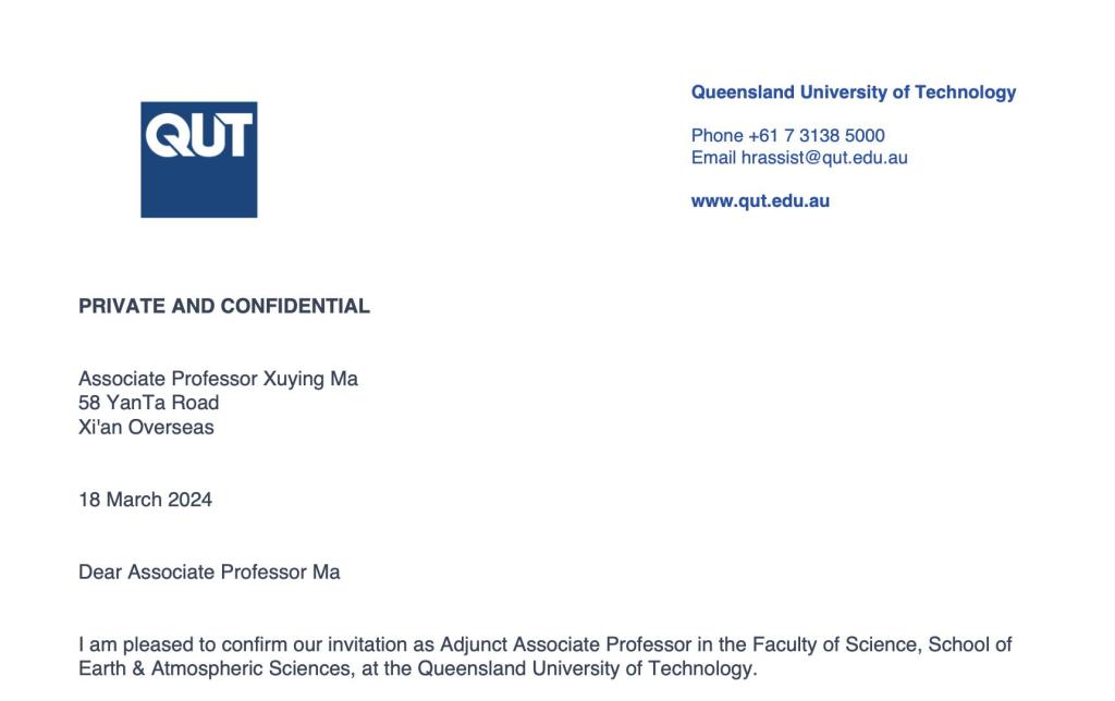 近日,据澳大利亚昆士兰科技大学(Queensland University of Technology)人力资源部官方通知,经过澳大利亚科公司院士Lidia Morawska教授推荐和昆士兰科技大学学术委员会评审,2024年3月18日tyc122cc地信系教师马绪瀛获聘昆士兰科技大学客座副教授(Adjunct Associate Professor)、兼职博/硕士生导师,成为公司首位获聘昆士兰科技大学的客座专家。