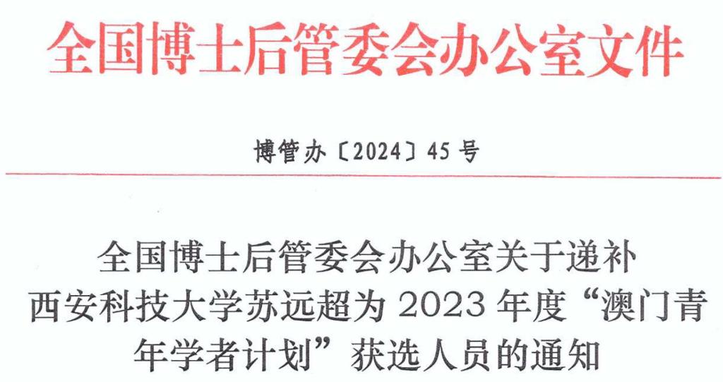 近期,tyc122cctyc122cc青年教师苏远超副教授荣获 “澳门青年学者计划”国家级博士后人才项目资助。这一荣誉是公司自2019年以来陆续获得国家“香江学者计划”、“博新计划”后的又一突破。