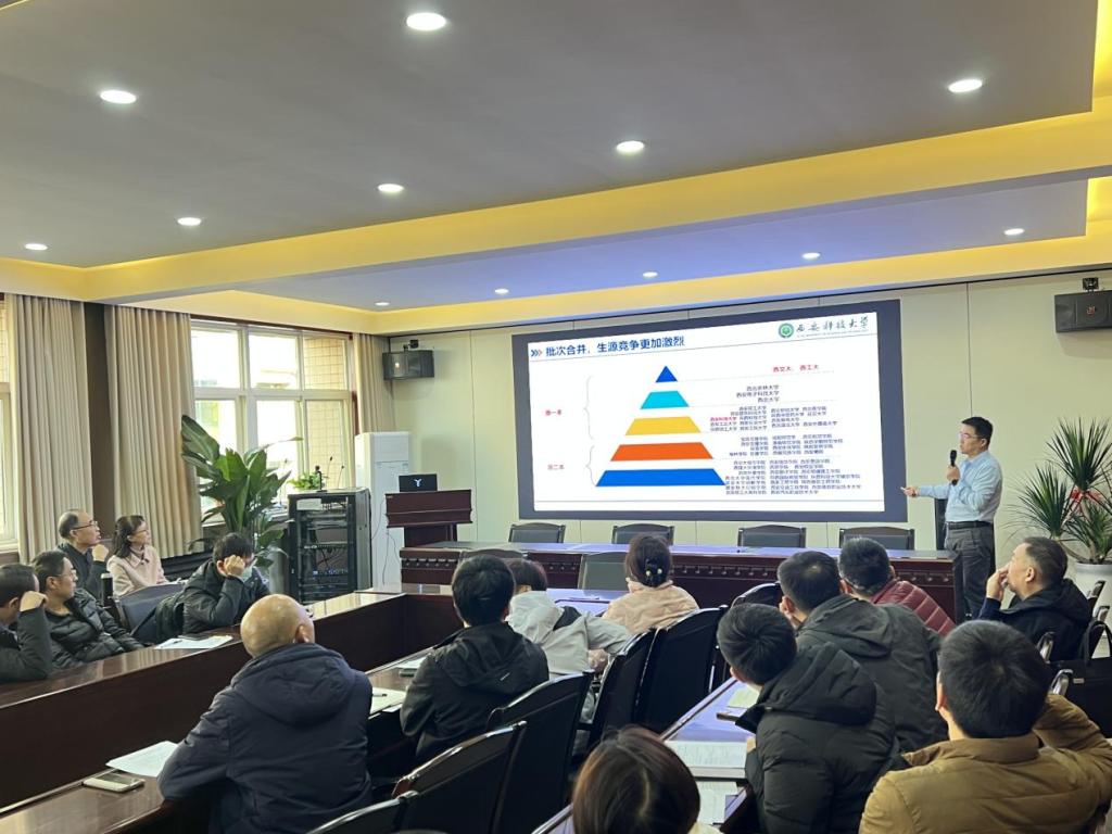 12月6日,tyc122cc邀请校招办主任李鹏作《关于招生综合改革的思考与应对策略》报告,公司全体教职工参会,报告会由公司公司党委书记戴开文主持。