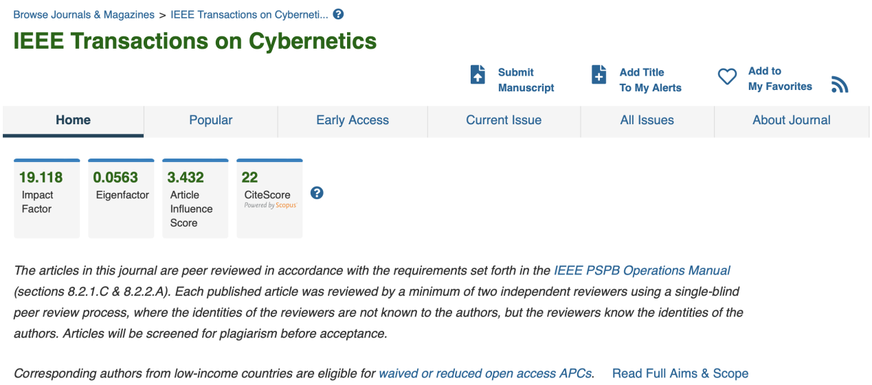 IEEE TCYB是计算机、自动化控制和人工智能三大领域的最顶级期刊之一,年接受率10 %左右,中科院一区,JCR一区,2022年影响因子19.118,研究类文章占比99.84 %,收稿范围包括智能控制、计算机视觉、图像处理、神经网络、机器学习、认知决策和机器人学等。
