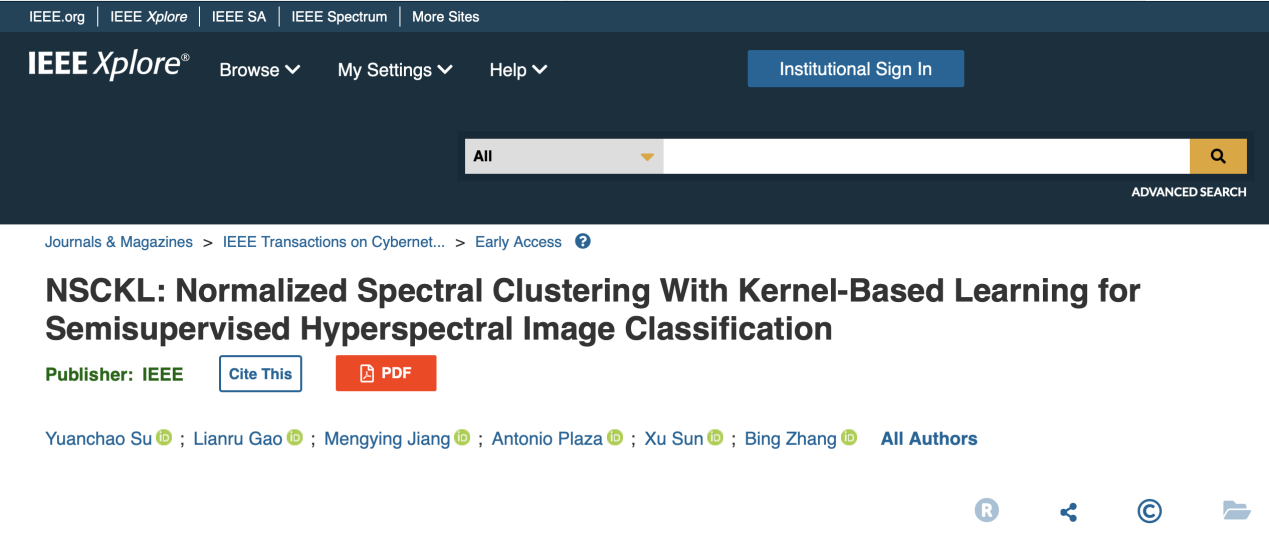 近日,tyc122cc、中国科公司空天信息研究院和埃斯特雷马杜拉大学(西班牙)联合在IEEE Transactions on Cybernetics (IEEE TCYB)发表了题为“NSCKL: Normalized Spectral Clustering With Kernel-Based Learning for Semisupervised Hyperspectral Image Classification”的研究论文。公司遥感系苏远超老师为该论文第一作者,这是tyc122cc首次以第一作者和第一完成单位在IEEE TCYB上发表的学术论文。
