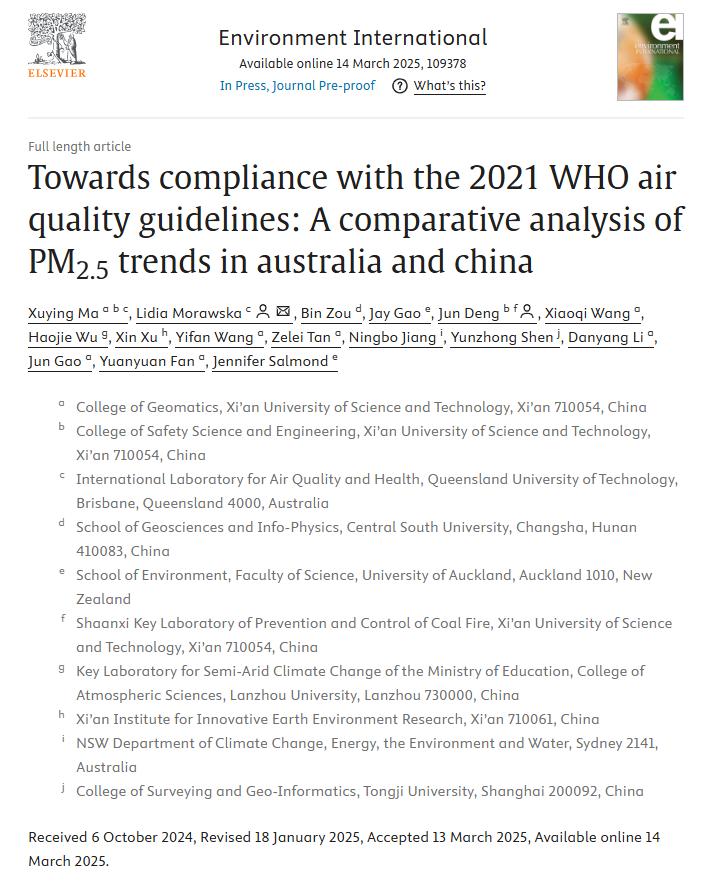 引用格式:Ma, X., Morawska, L.*, Zou, B., Gao, J., Deng, J.**, Wang, X., Wu, H., Xu, X., Wang, Y., Tan, Z., Jiang, N., Shen, Y., Li, D., Gao, J., Fan, Y., Salmond, J. Towards compliance with the 2021 WHO air quality guidelines: A comparative analysis of PM2.5 trends in australia and china. Environment International, 2025, p.109378.